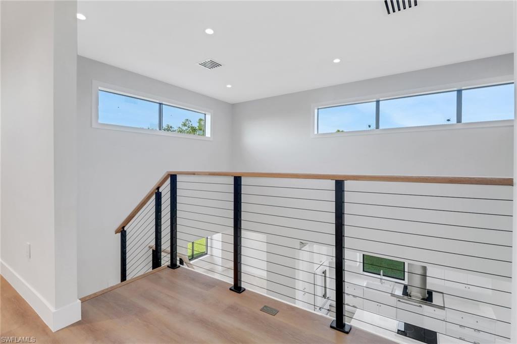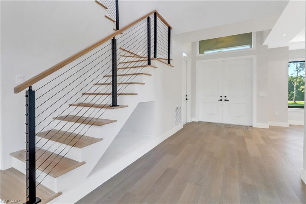 Las modernas barandillas de las escaleras agregan un toque contemporáneo al diseño del hogar, combinando perfectamente con las escaleras de madera, que mezclan la belleza natural con durabilidad. Ningún detalle ha sido pasado por alto, con luces bajo los gabinetes de la cocina que ofrecen iluminación práctica y ambiente. La casa también está preinstalada para iluminación exterior y cámaras, agregando un nivel adicional de seguridad y conveniencia.